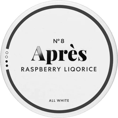 Après Raspberry Liqorice från varumärket Après är vitt snus med normal styrka och med bär och lakrits smak. Après Raspberry Liqorice kommer i slim format och varje dosa rymmer 20 portioner. Après är tillverkat av Après Nicotine AB.