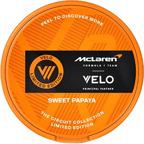 VELO McLaren Sweet Papaya Limited Edition från varumärket VELO är vitt snus med stark styrka och med frukt smak. VELO McLaren Sweet Papaya Limited Edition kommer i slim format och varje dosa rymmer 20 portioner. VELO är tillverkat av BAT.