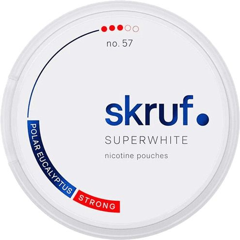 Skruf Superwhite No. 57 Polar Eucalyptus Strong är ett tobaksfritt vitt snus i slim-format från Skruf Snus. Produkten är en del av Skrufs Superwhite-serie och innehåller nikotin men ingen tobak. Prillorna är helvita, slimmade och utformade för att sitta diskret och bekvämt under läppen utan att missfärga tänderna.