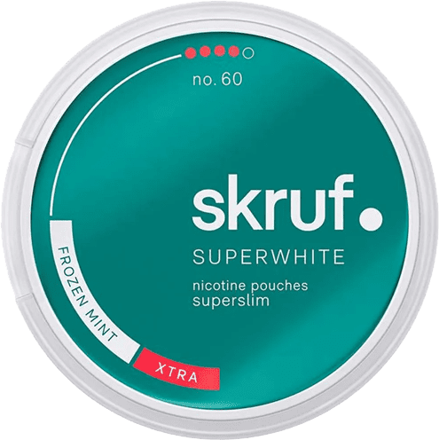 Skruf Superwhite No. 60 Frozen Mint Superslim Xtra Strong är tillverkad av växtfibrer och innehåller ingen tobak. Varje dosa innehåller 17,3 g snus och är ett utmärkt val för dig som vill ha en extra stark nikotineffekt kombinerad med en tydlig, fräsch mintprofil i ett mycket diskret format.